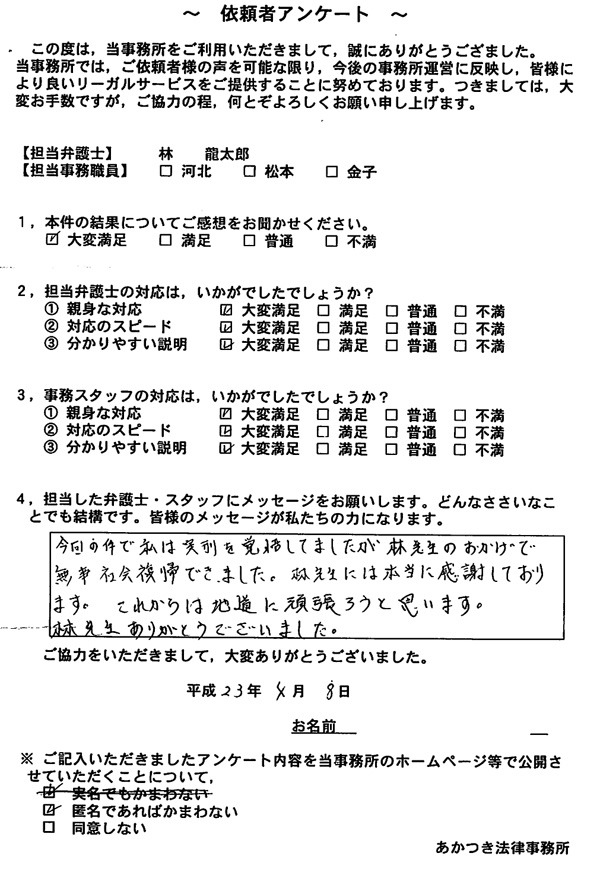 あかつき法律事務所に実際に依頼された体験談の一例(依頼者様の声をご覧ください。)